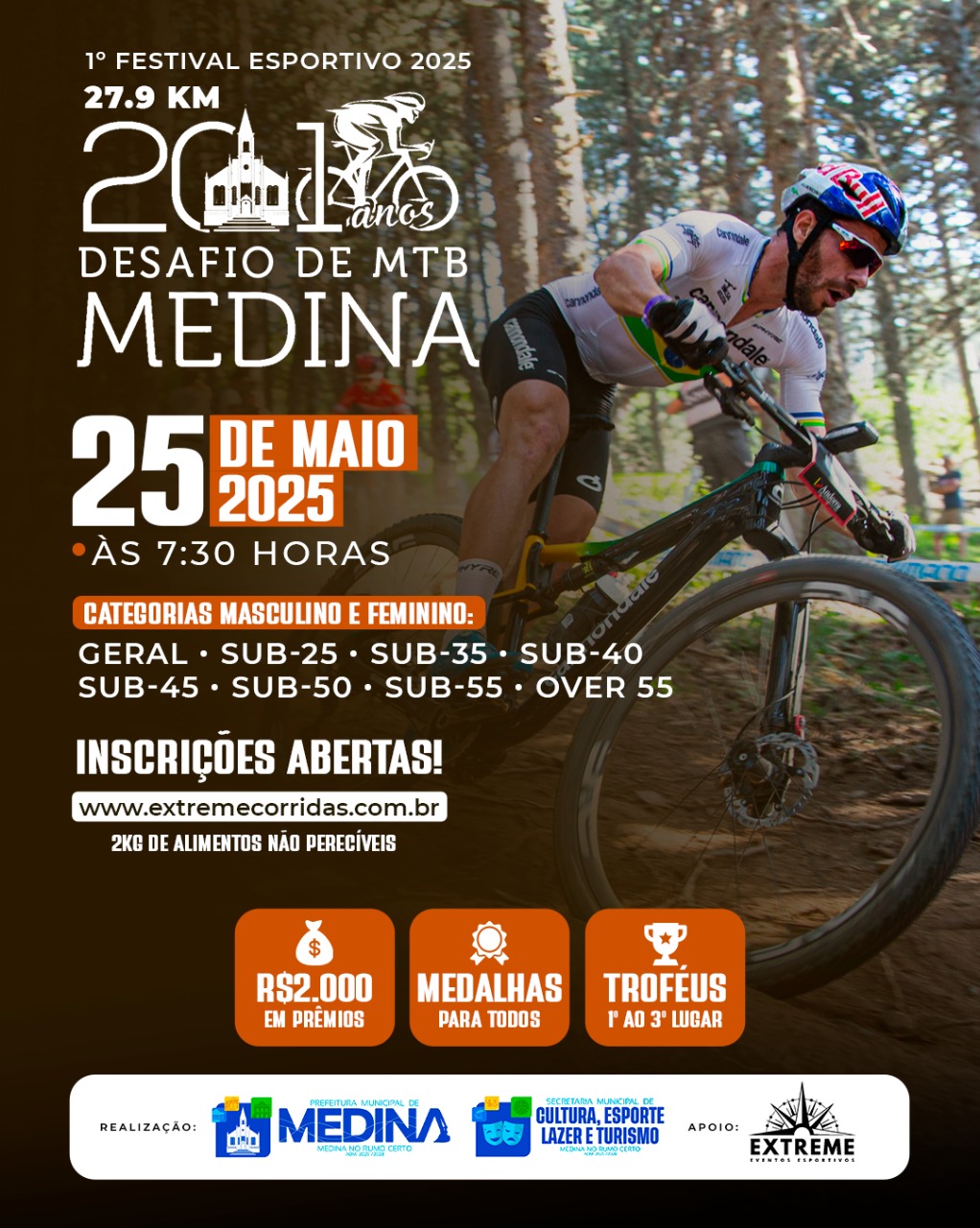 1º Festival Esportivo 2025 Moutain Bike Categorias Masculino e Feminino Premiação: Inscrição: